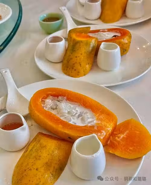 燉煮:把雪蛤、木瓜塊、冰糖一起放入燉盅,加入適量清水,隔水燉煮 30 分鐘。
