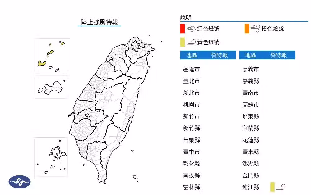 中央氣象署發布陸上強風特報!由於西南風增強,明天 (21) 下午至晚上,請注意連江縣局部地區有平均風6級以上或陣風8級以上發生的機率。近日全台高溫炎熱,氣象署亦示警4縣市嚴防高溫。