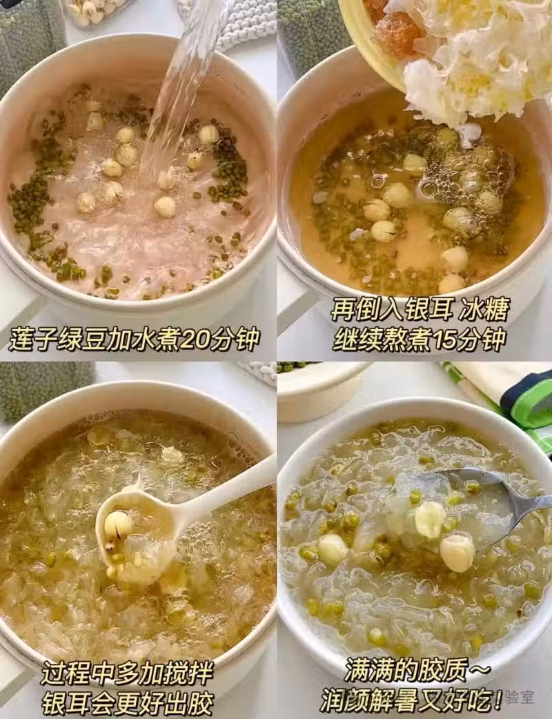 1️⃣綠豆和蓮子提前泡2小時,銀耳提前泡發撕成小朵,