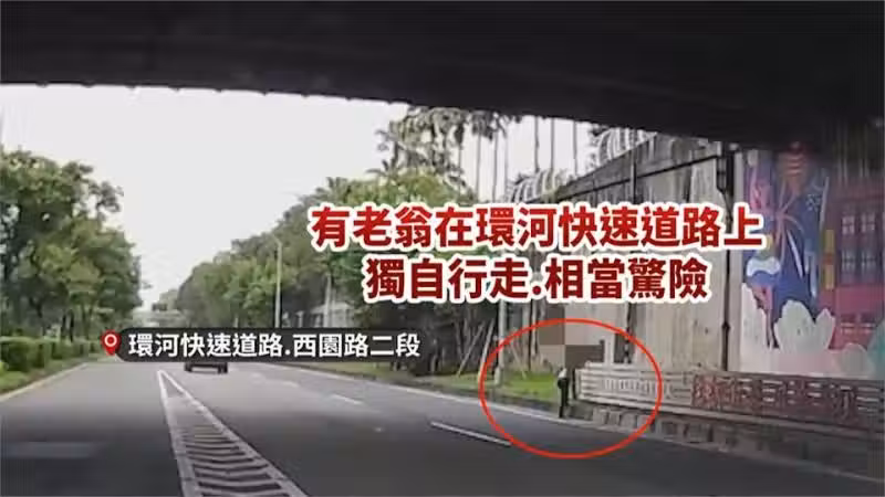 台北市環河快速道路上,有民眾拍下,一名老翁,站在路旁,扶著圍欄休息,接著繼續拿雨傘當拐杖,而且天氣熱到衣服脫到剩吊嘎,明顯體力透支,但這邊沒有人行道,其實相當危險。因為這邊,車流多、車速也快,這名老翁獨自行走,相當驚險,一問之下,