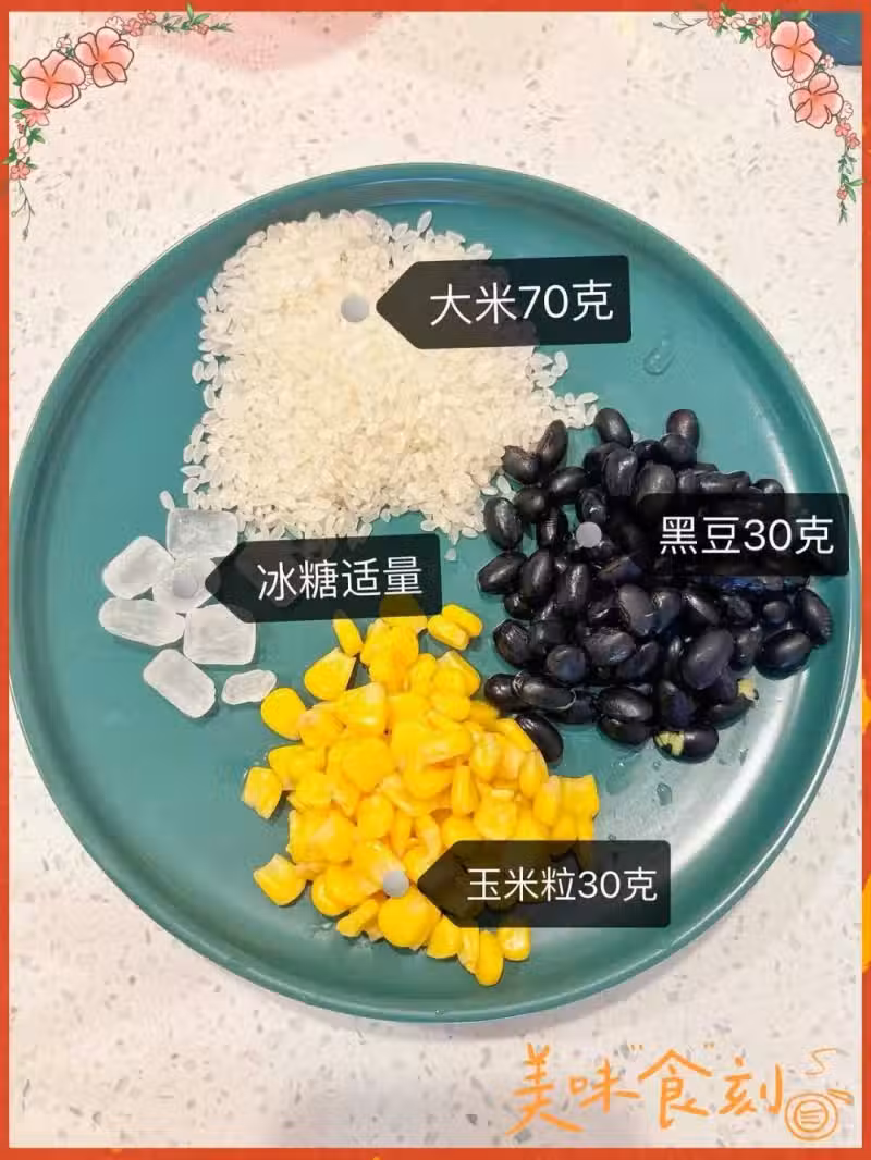 大米70克、黑豆30克、玉米粒30克