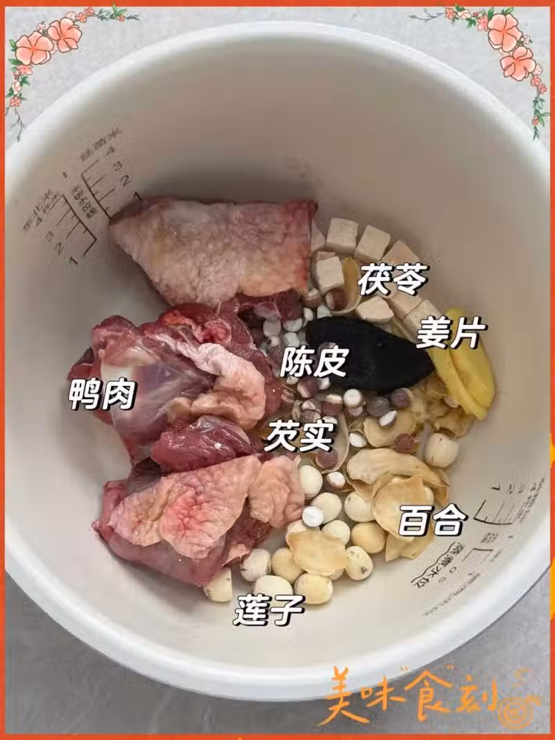 老鴨半隻(約500克)、干蓮子20克、干百合15克、茯苓10克、芡實10克、