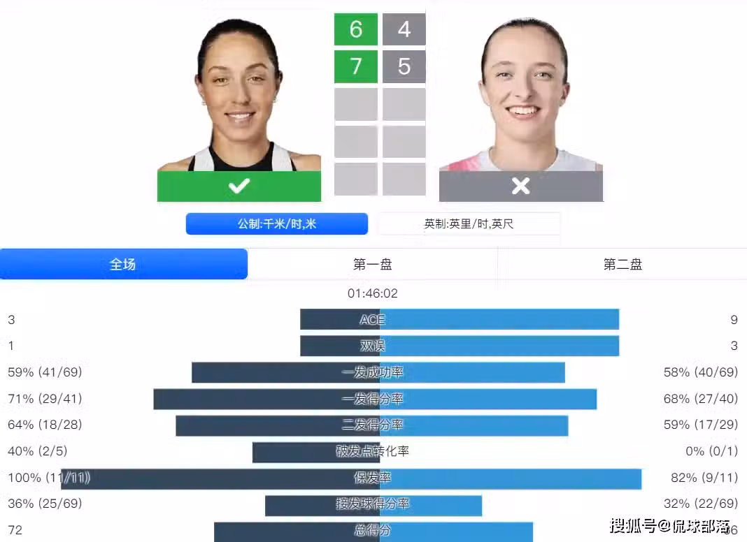 全場數據統計,佩古拉轟出3個ACE球,一發成功率59%,同時一發得分率71%、二發得分率64%、破發點轉化率40%、接發點得分率36%,其中非受迫性失誤16個,遠低於斯瓦泰克的35個。控制失誤,也是佩古拉能夠拿下比賽的主要原因。