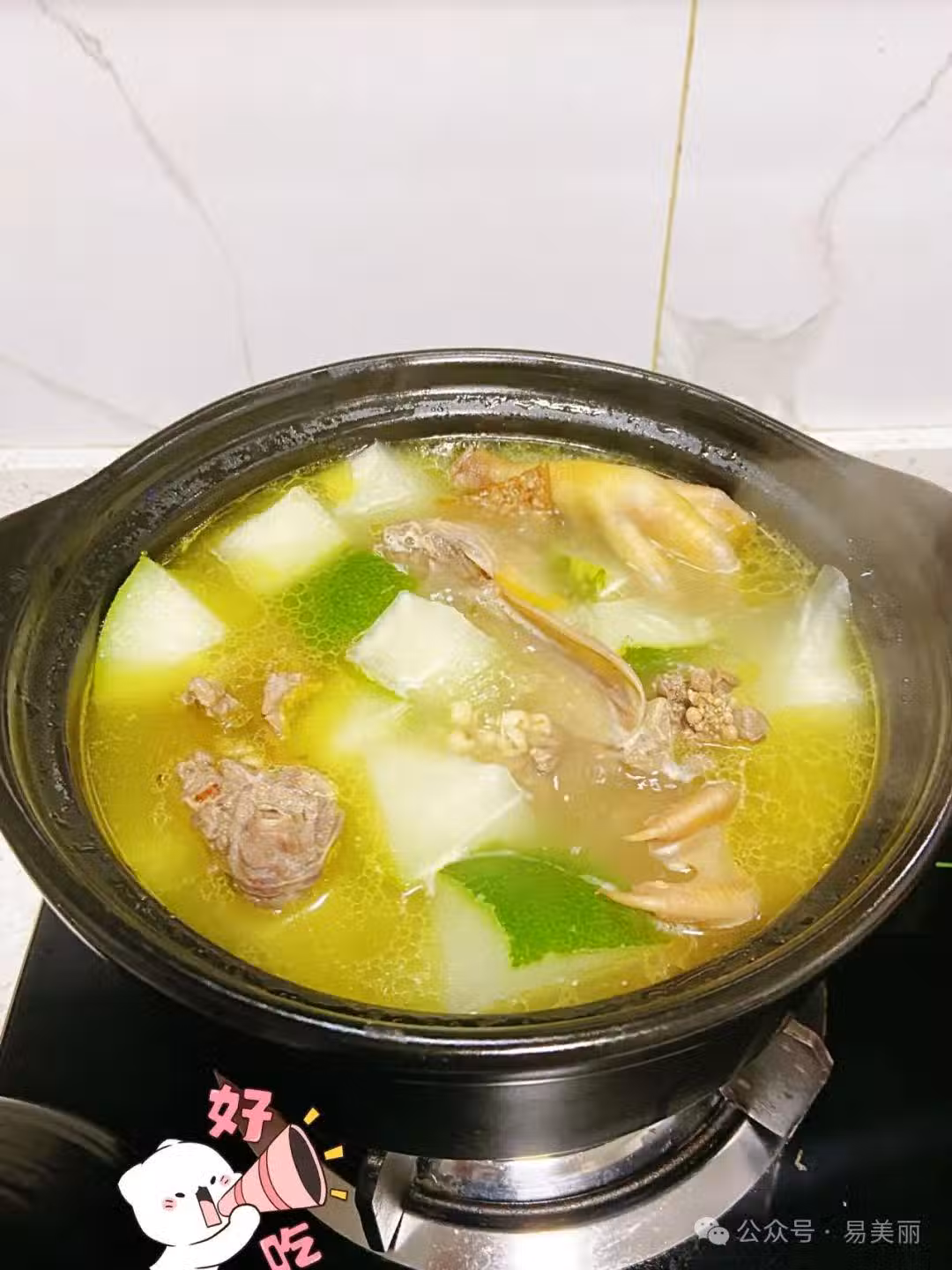 您好,這位是冬瓜,江湖人稱「天然冰袋」。這道湯堪稱夏日「降溫神器」。冬瓜96%含水量自帶降溫屬性,丙醇二酸成分專克脂肪堆積,膳食纖維還能給腸胃做SPA。喝時先舀碗清湯潤喉,再夾塊吸飽鴨油的冬瓜,咸鮮中透著清甜,比空調房還解暑。