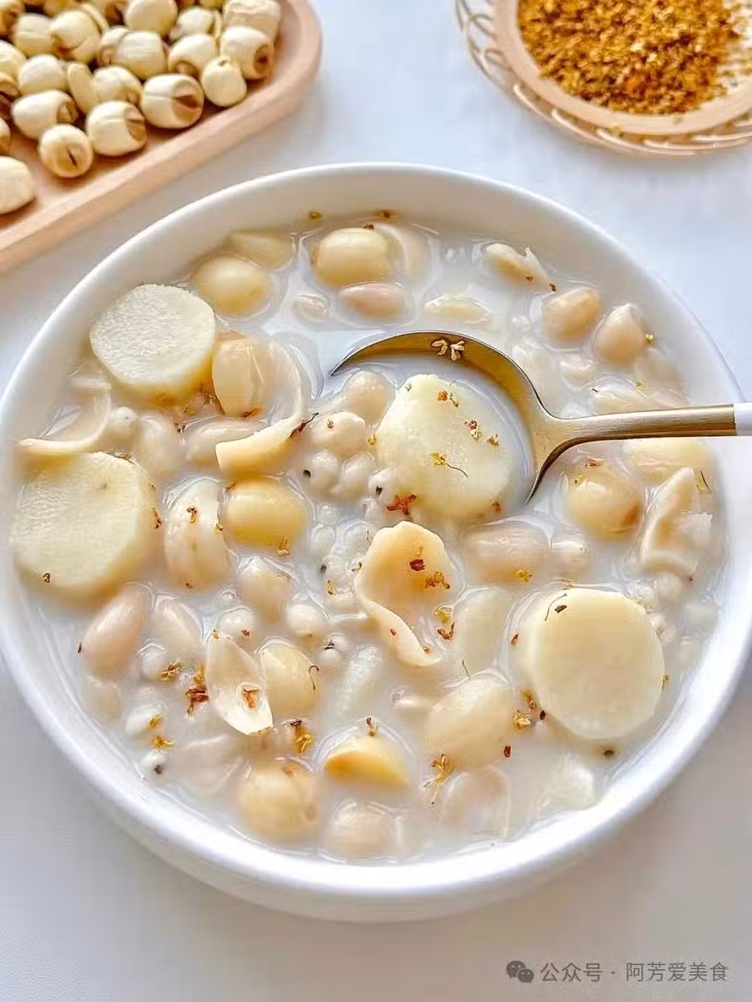 姑姑在城裡大醫院做了一輩子,臨走時給我分享了一個小食譜,上面有這幾個食材組成:山藥、蓮子、百合、花生、冰糖,還有牛奶。