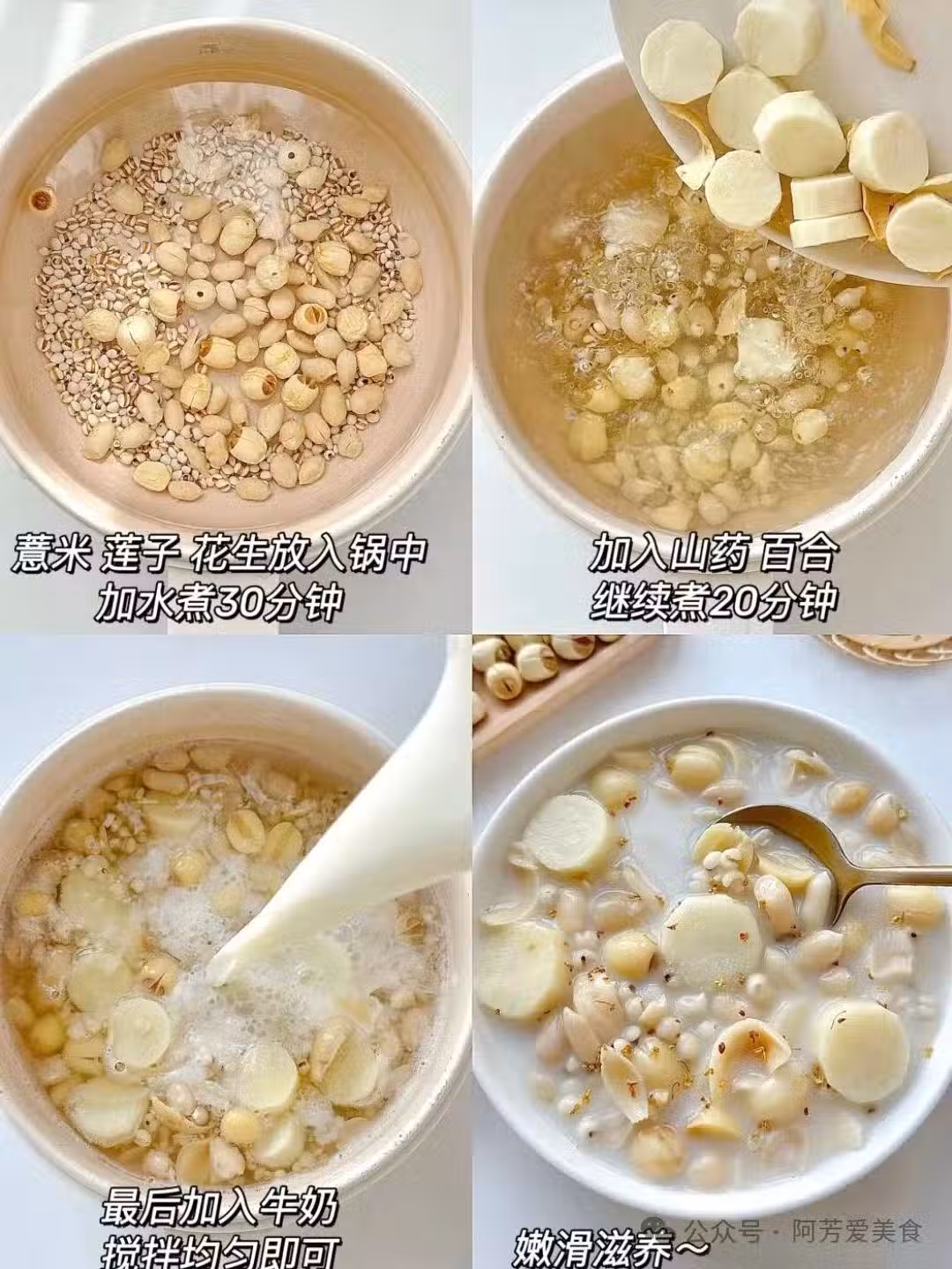第一次煮好,我捧著碗坐在小陽台上慢慢喝。溫熱的湯汁滑進喉嚨,帶著牛奶的醇和冰糖的清甜,嚼著粉糯的山藥和蓮子,百合瓣軟軟的,花生吸飽了湯汁變得綿軟。