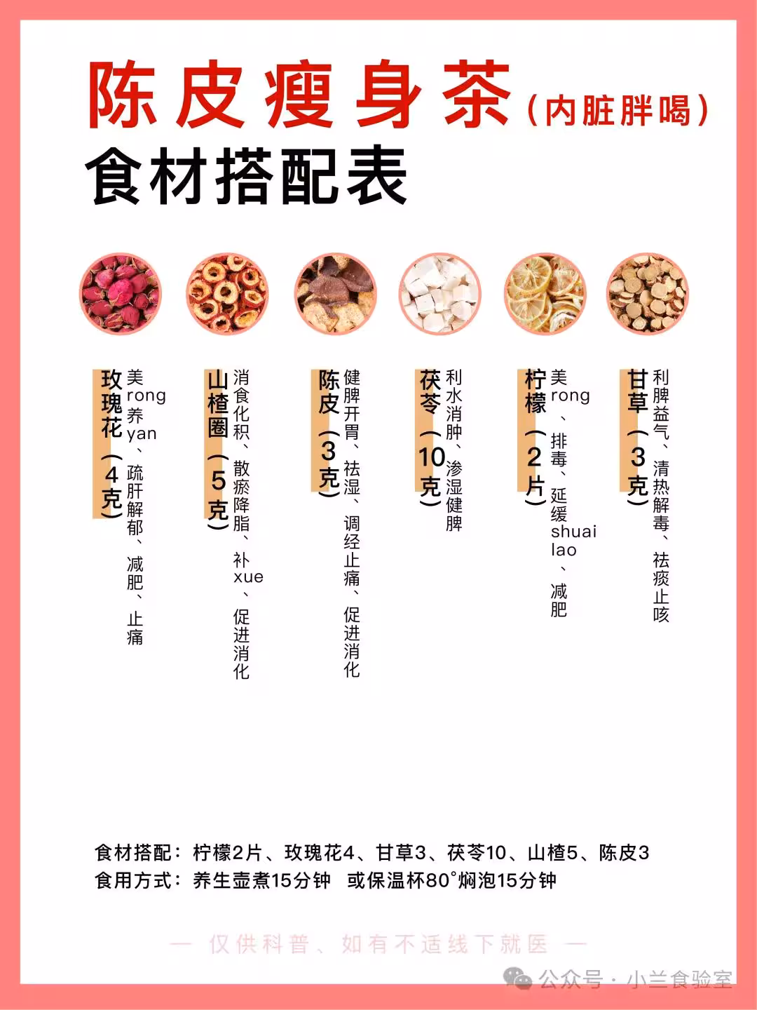 檸檬2片、玫瑰花4g、甘草3g、茯苓10g、山楂5g、陳皮3g