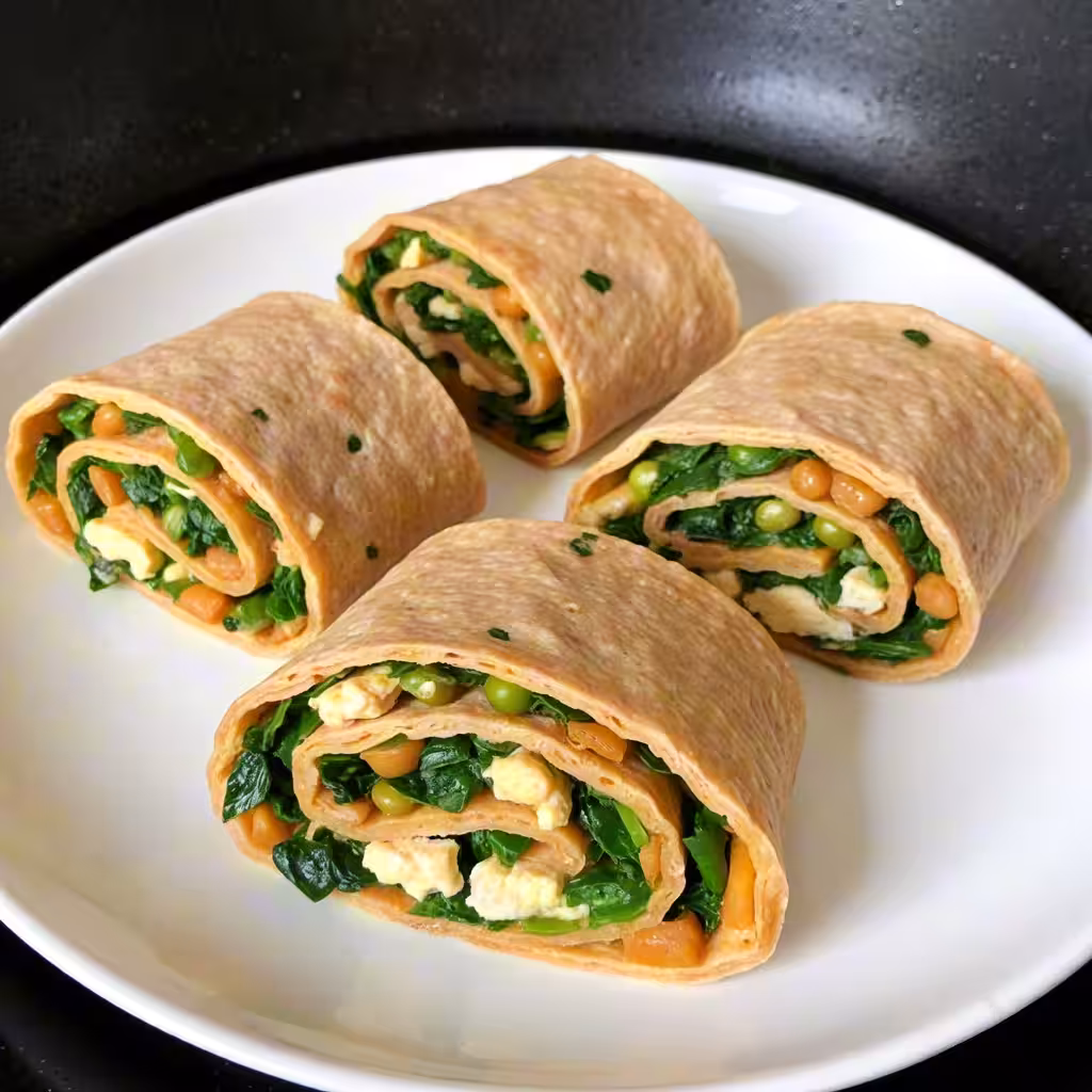 【食材】:菠菜100g、豆腐1塊、雞蛋1個、全麥餅皮2張、鹽少許。