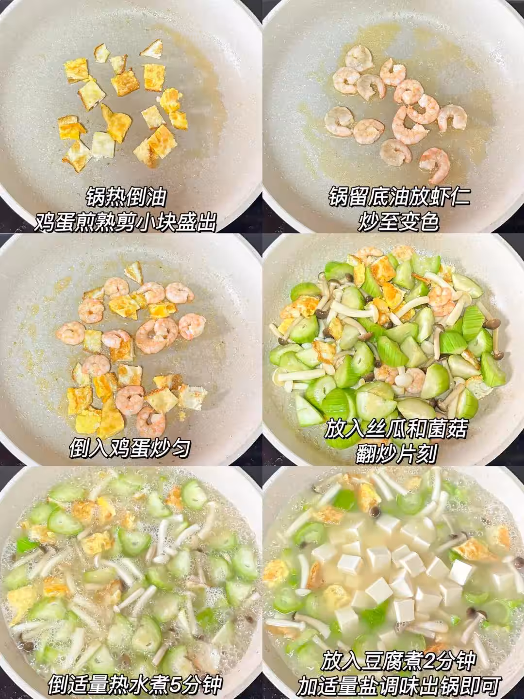 3️⃣、把之前煎好的雞蛋倒回去,和蝦仁一起炒勻。把切好的絲瓜和菌菇也倒進去,一起翻炒一會兒;