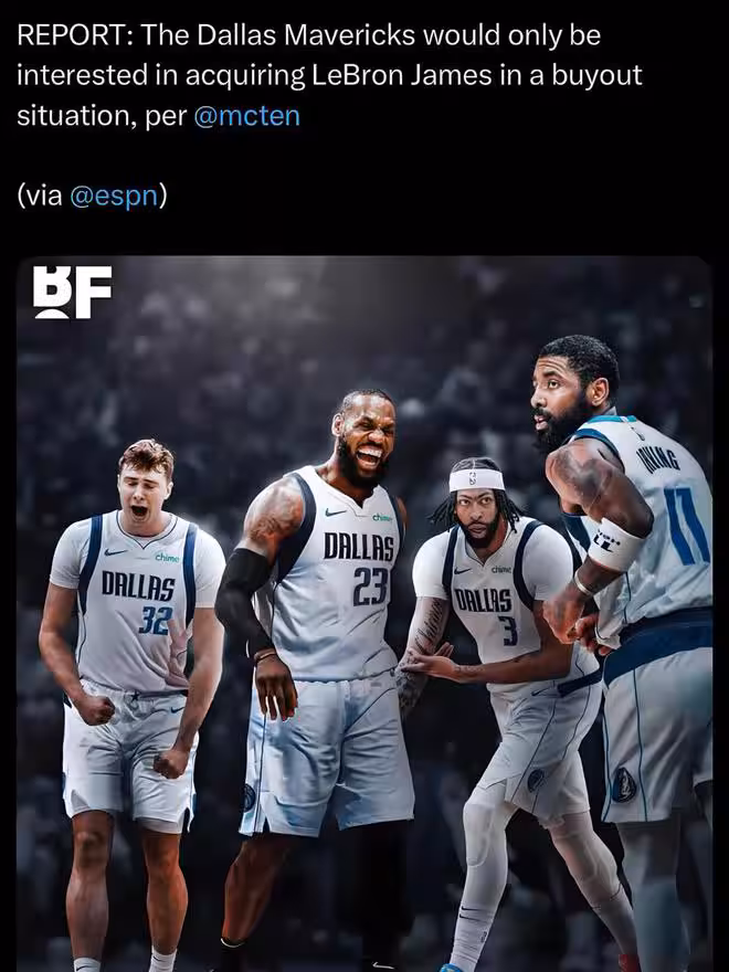 可問題卡殼就卡在這兒了:包括獨行俠在內,所有對老詹流口水的球隊,沒一個願意真掏家底兒做交易。老詹想拿錢又想走,湖人這邊新老闆要止損,絕不同意白白失去一筆資產......得,全僵這兒了。