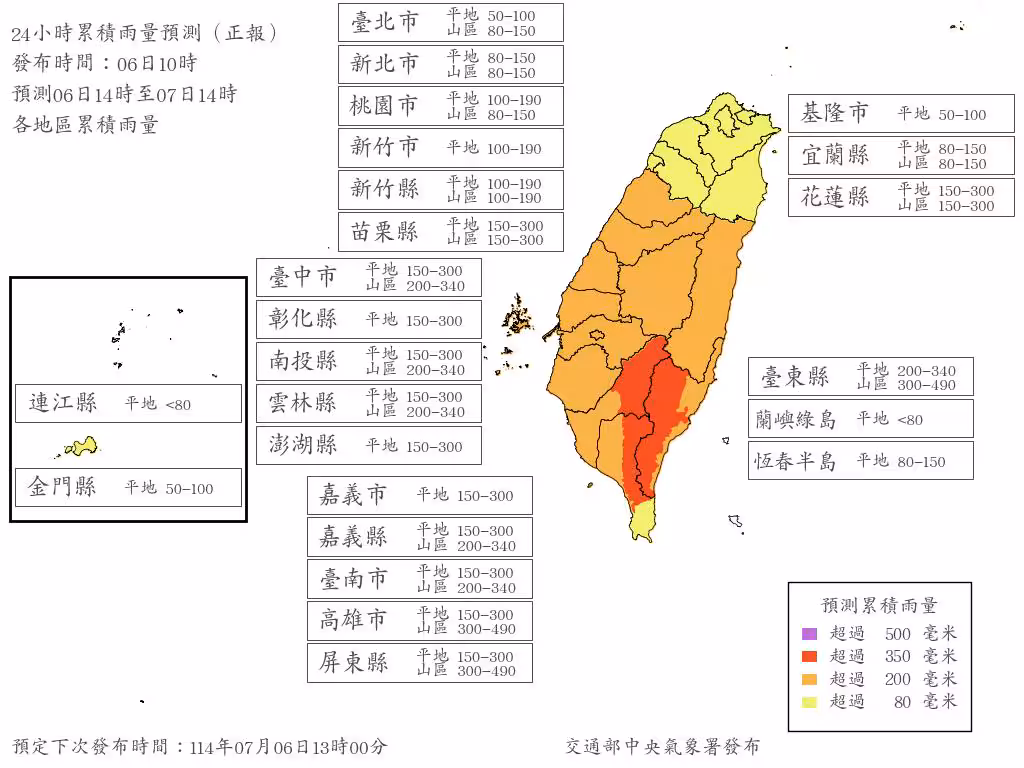 而停班停課雨量標準為不分山區或平地350毫米的則包括有基隆市、台北市、新北市、新竹市、彰化縣、嘉義市、台南市及離島。