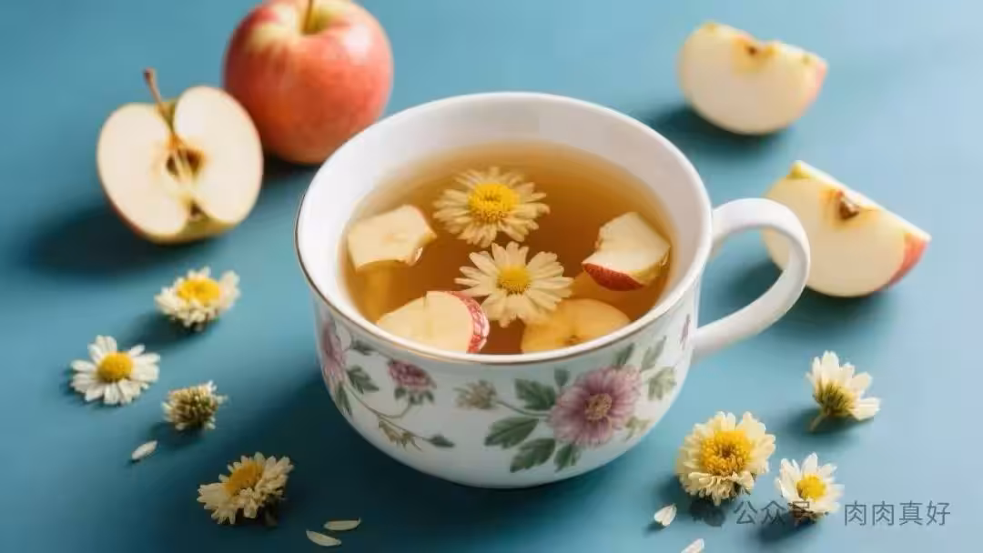 做法:蘋果1 個切塊,菊花 5 朵(胎菊、貢菊隨便選),加水煮 15 分鐘,上班、上學時當水喝,緩解眼疲勞