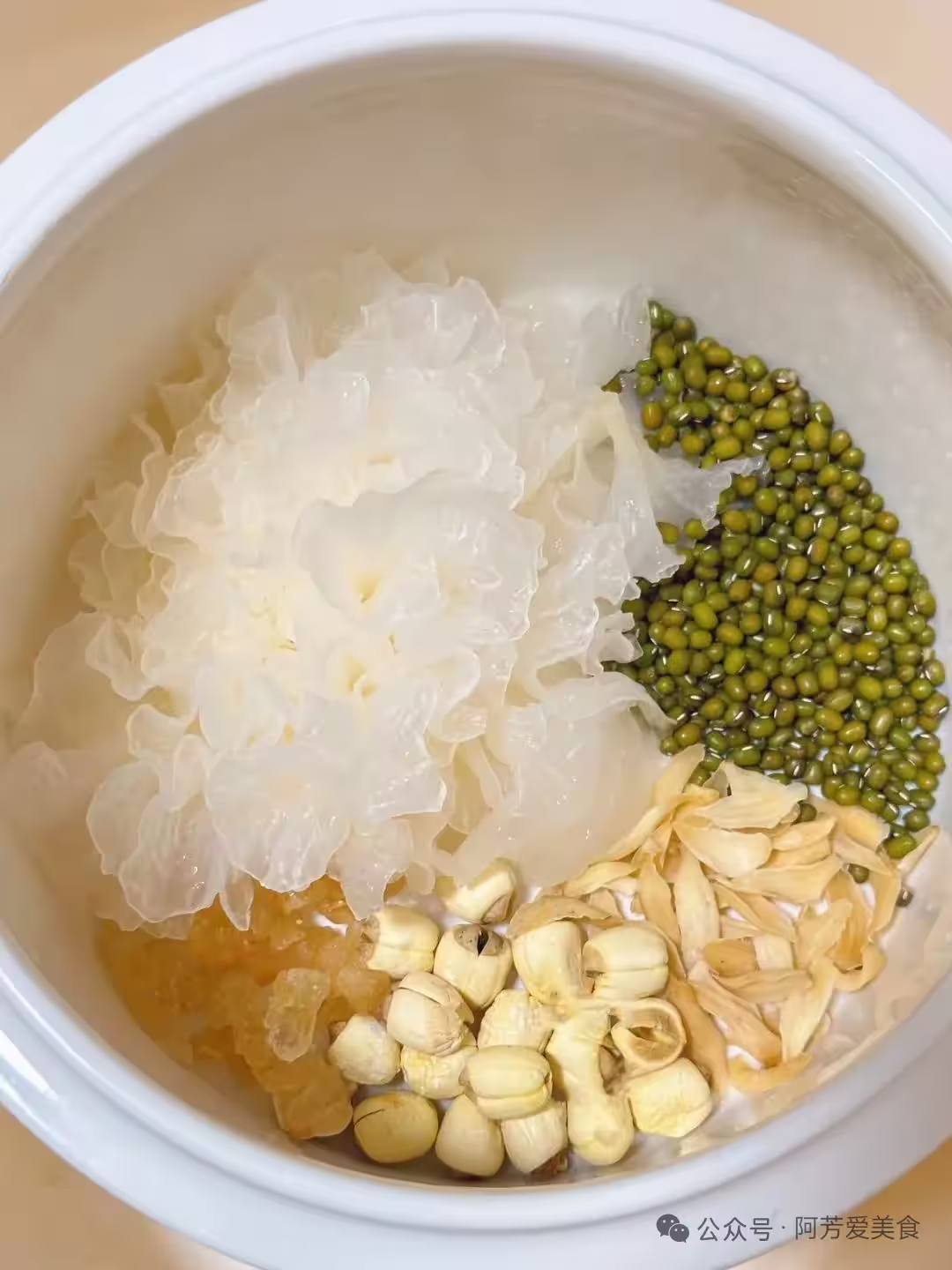 干銀耳泡發撕小朵,綠豆、干百合、蓮子(怕苦就去掉蓮心,想保留原本味道就不去)各一小把洗凈。所有食材放入燉盅,加幾塊冰糖,倒入足量清水。隔水慢燉兩小時左右。