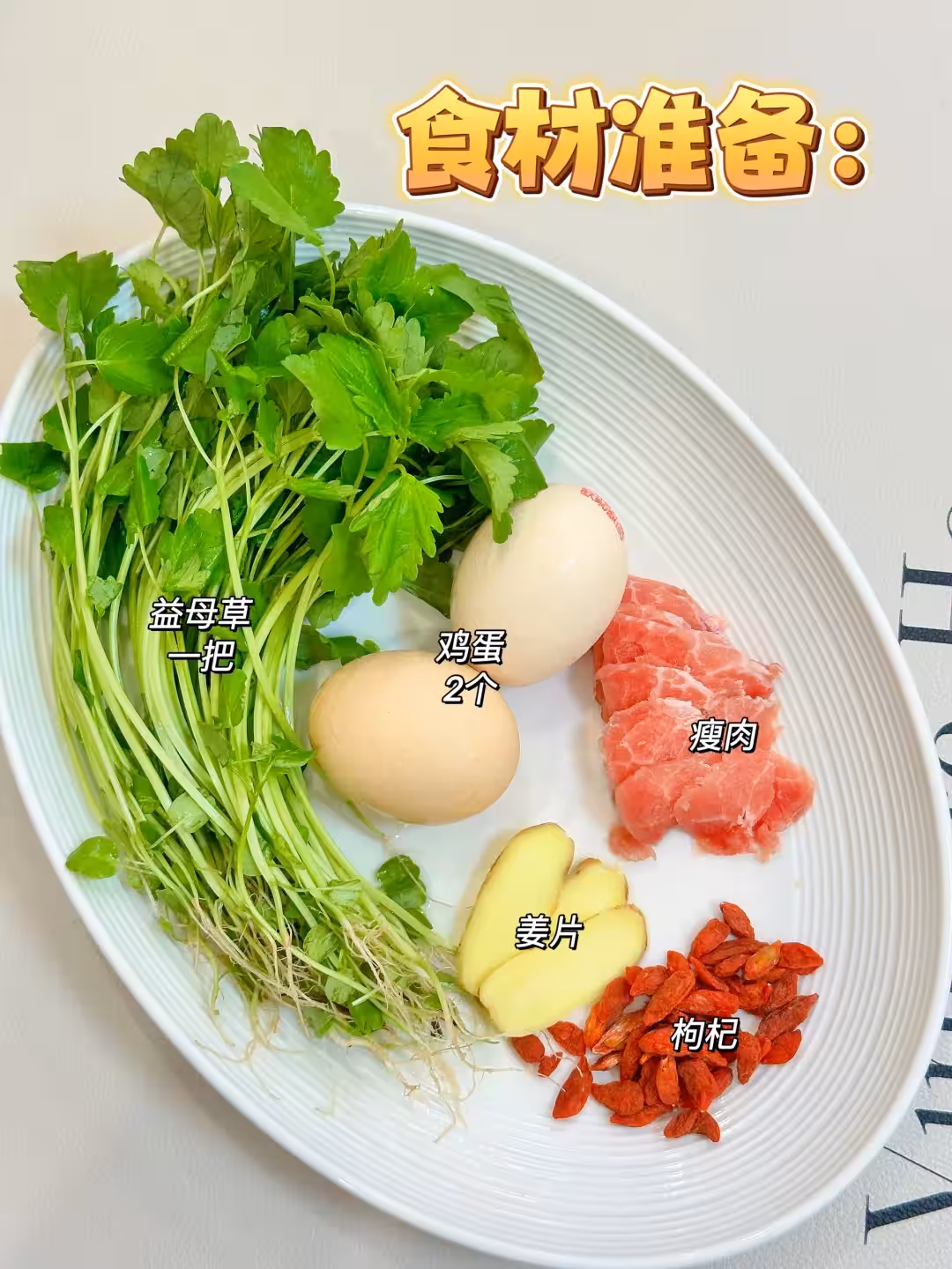食材:新鮮益母草 1把 、雞蛋 2個 、瘦肉 100克 、薑片 3片 、枸杞 適量