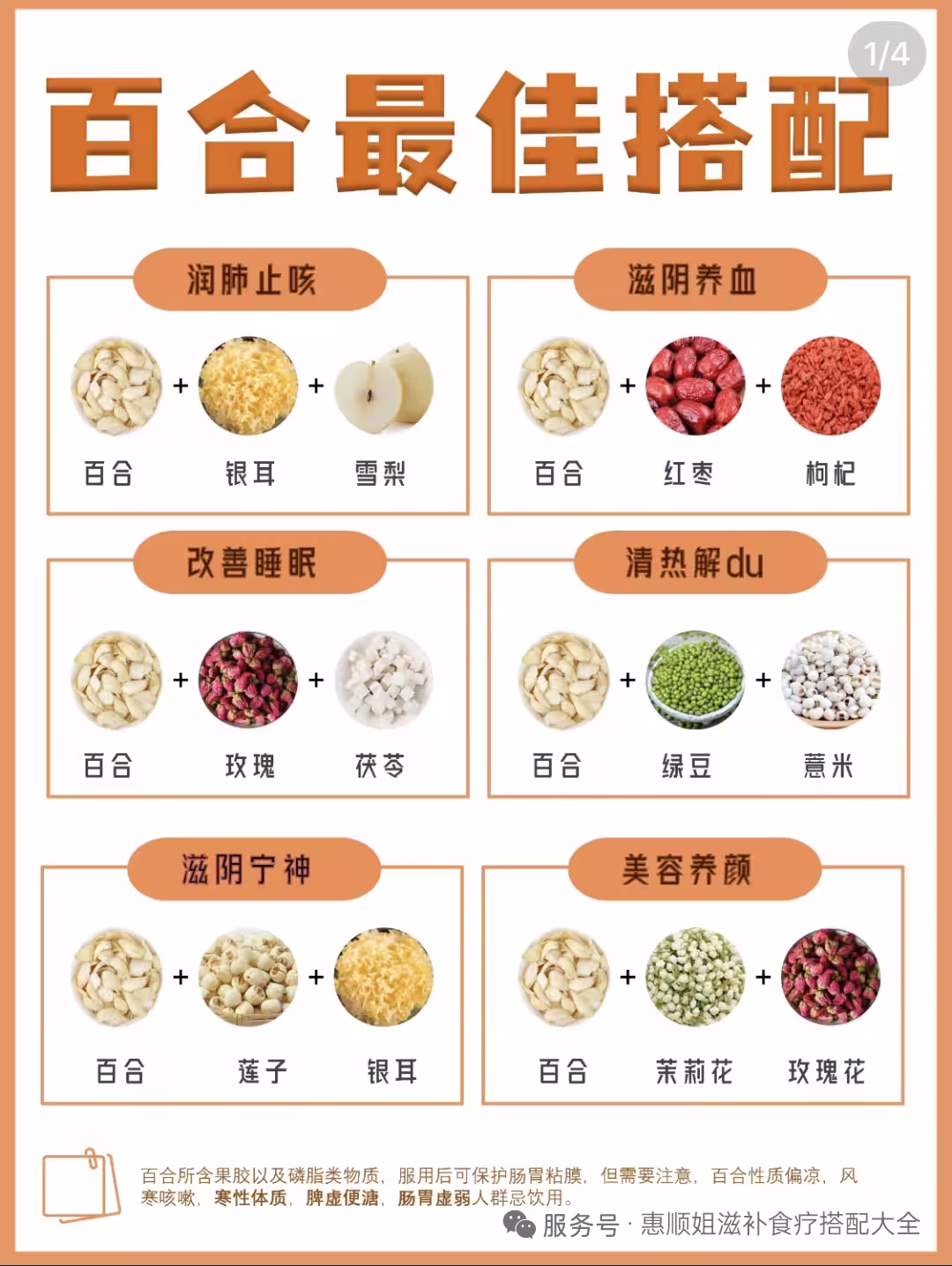 ✨《黃帝內經》記載白色通於肺,百合就是不錯的選擇~ ✨《本草綱目》記載,百合性味甘,微苦、微寒,能養陰閏肺、清新安shen。 ✨百合主入肺經,常用它應對肺燥、肺熱咳嗽的問題,且百合中又含有豐富的黏液質,對陣靜'K嗽也有幫助👍🏻。 🌈今天,給大家分享一些百合的養生搭配和日常用法。