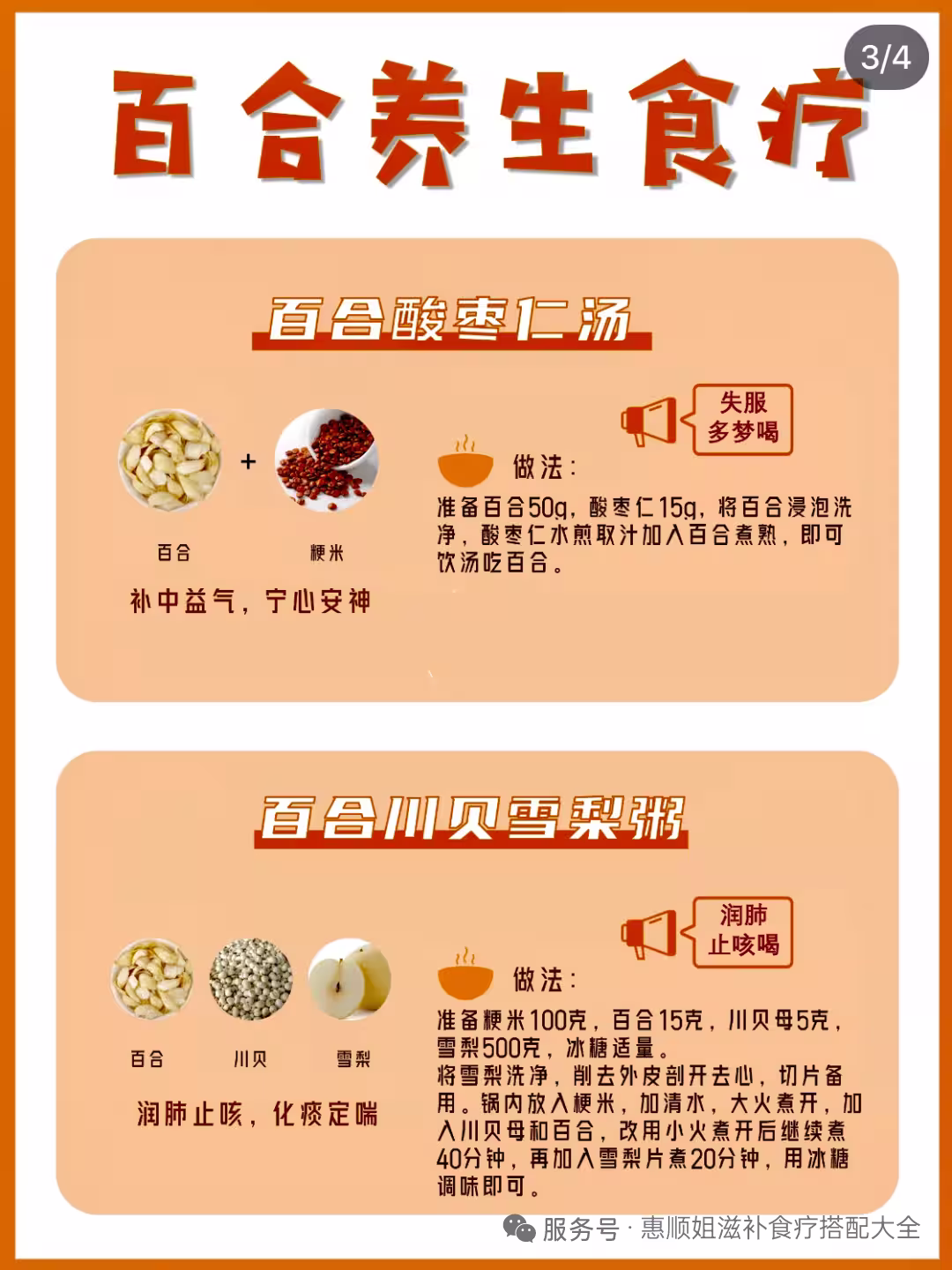 ✅圖3﹌4:百合養生食療🌸 ✨具體做法,用量圖上有寫明克重,按實際需求加減量⁉️ ✨百合是run燥養顏的擔當,對女生非常友好。 ✨百合的搭配和用法,姐妹們都學會了嗎⁉️