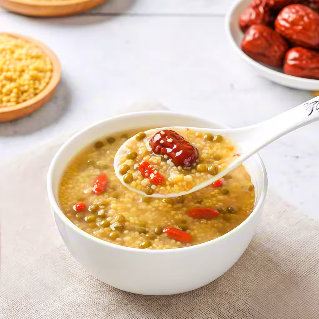 小米30g、綠豆20g、枸杞10g、紅棗5顆、冰糖適量。
