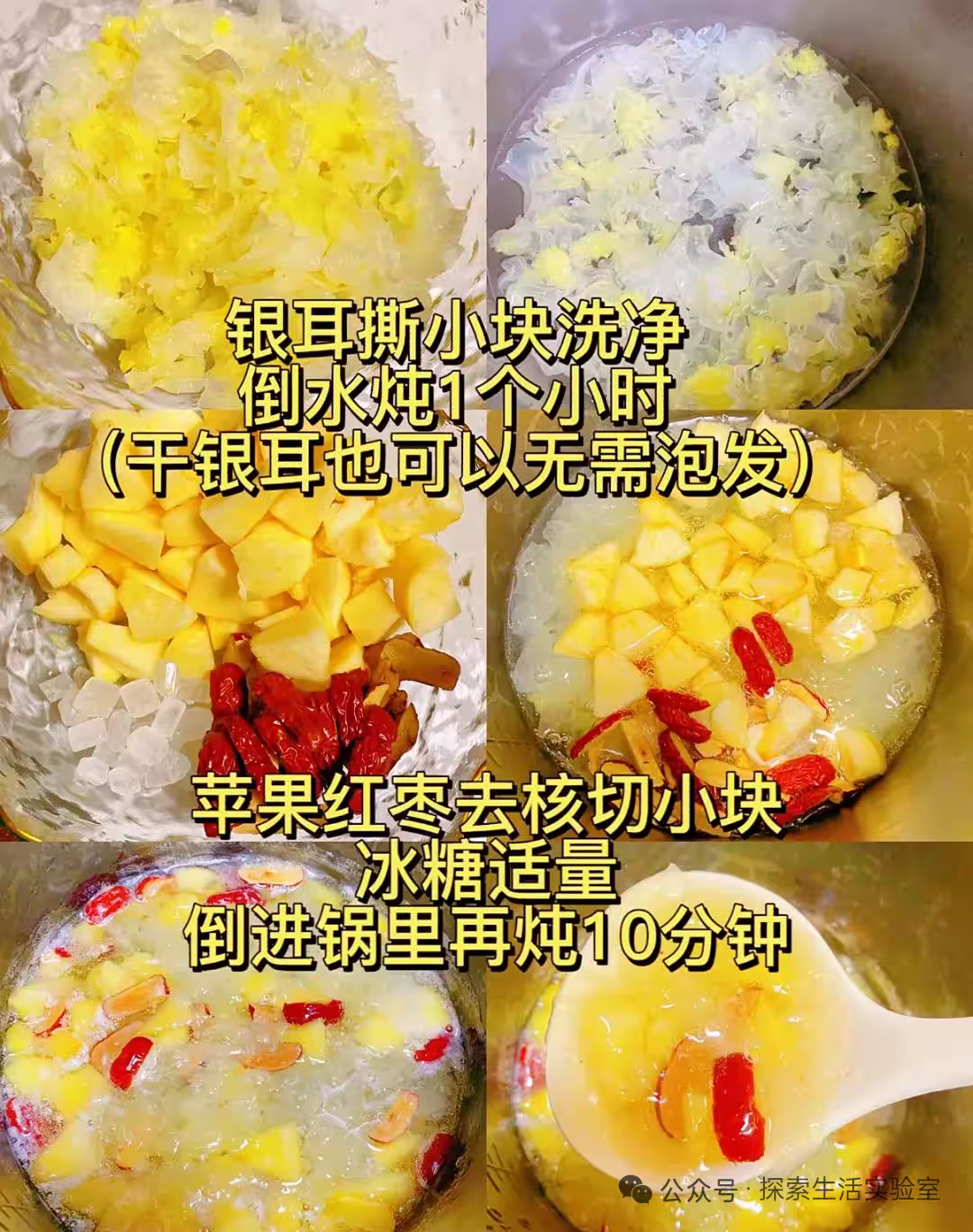 1️⃣銀耳提前用冷水泡1小時,泡開後撕成小朵,黃色的根切掉(不然煮不爛)