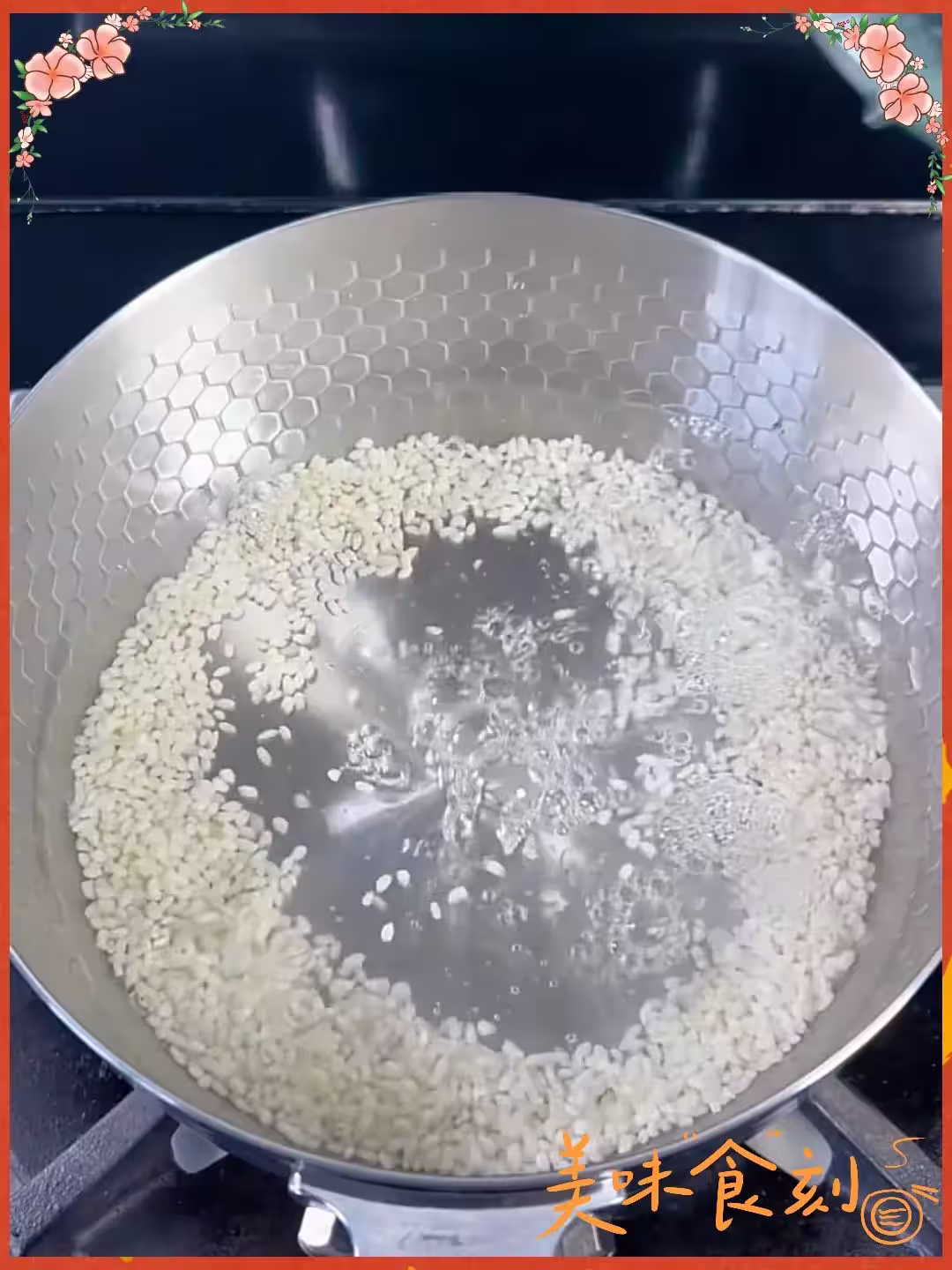 ①取一小撮胚芽米(大約5.5克),用清水簡單沖洗一遍,放進鍋里,往裡倒1000毫升左右的水,開小火慢慢熬煮;