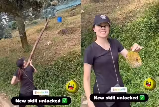 視頻中,她拿著一根木棍,將已經成熟、掉落在防護網上的榴槤捅下,隨後撿起並開心地舉著榴槤合影留念,神情興奮,顯得十分投入。視頻內寫道:「解鎖新技能」,引發球迷熱議。