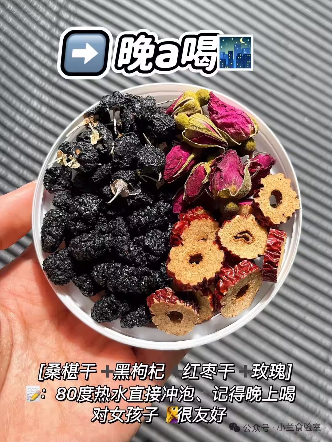 ✅ 桑葚+紅棗+玫瑰入杯→沖 200ml開水燜5分鐘→水溫降至60℃→加黑枸杞泡 2分鐘(防營養流失)