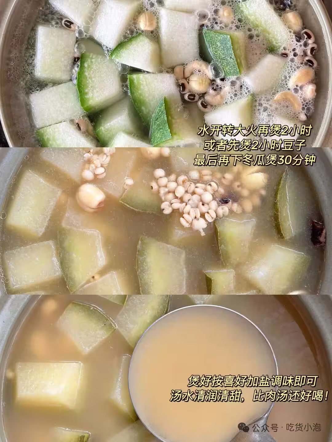 這款湯的精髓在於生腰果。先將眉豆、薏仁提前浸泡一晚,之後把所有食材一同放入鍋中,大火燒開後轉小火慢煲2小時。煲好後,依據個人口味加入適量鹽調味。其口感和味道甚至勝過肉湯,還沒嘗試過的朋友一定要去試試!