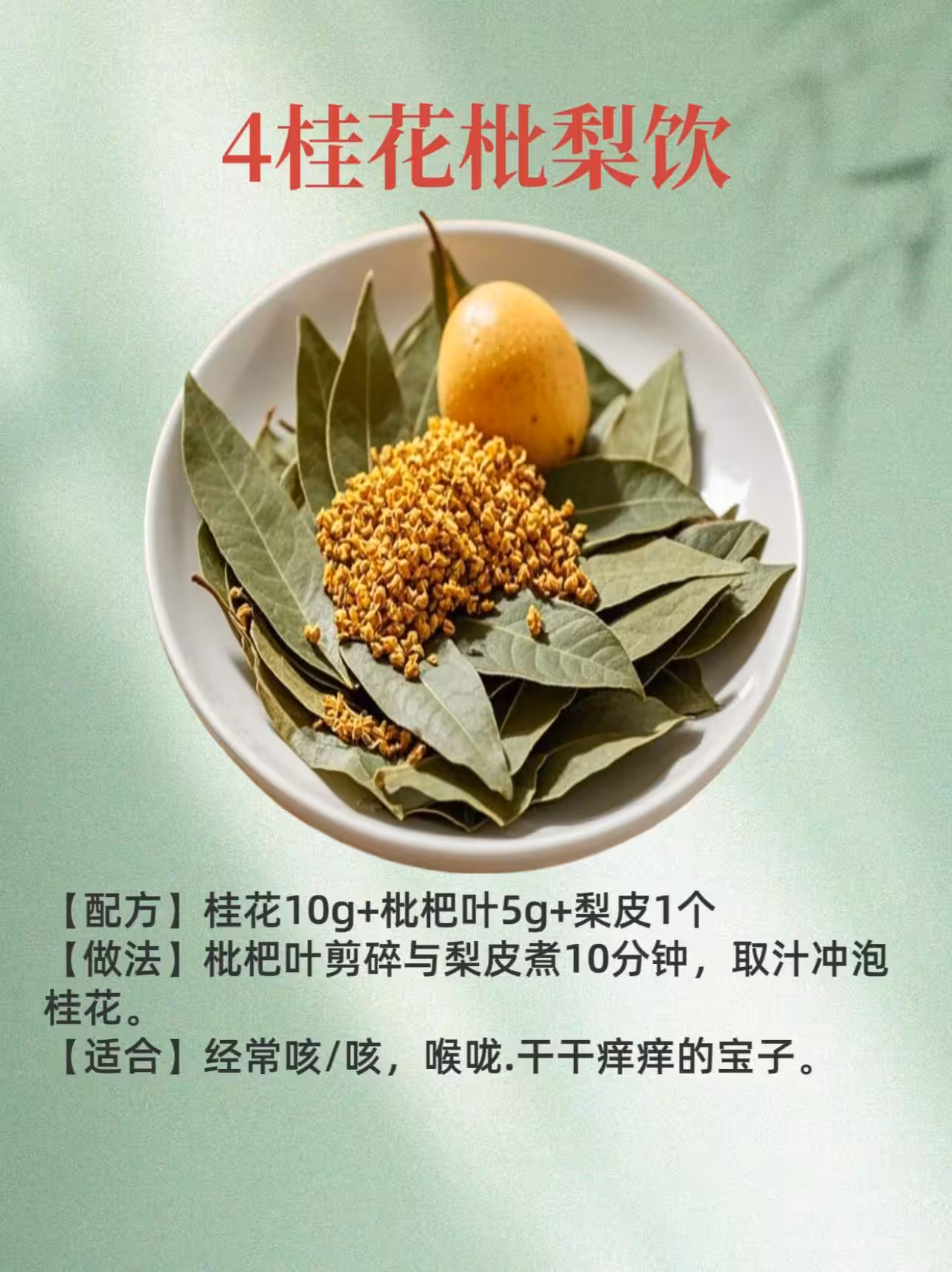 🍐桂花枇梨飲:咳/咳、喉嚨/干/癢的寶子有救啦!桂花、枇杷葉、梨皮煮10分鐘,取汁沖泡桂花,超級棒~