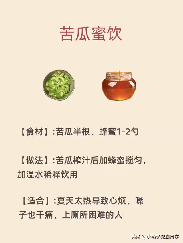 做法:苦瓜榨汁後加蜂蜜攪勻,加溫水稀釋!