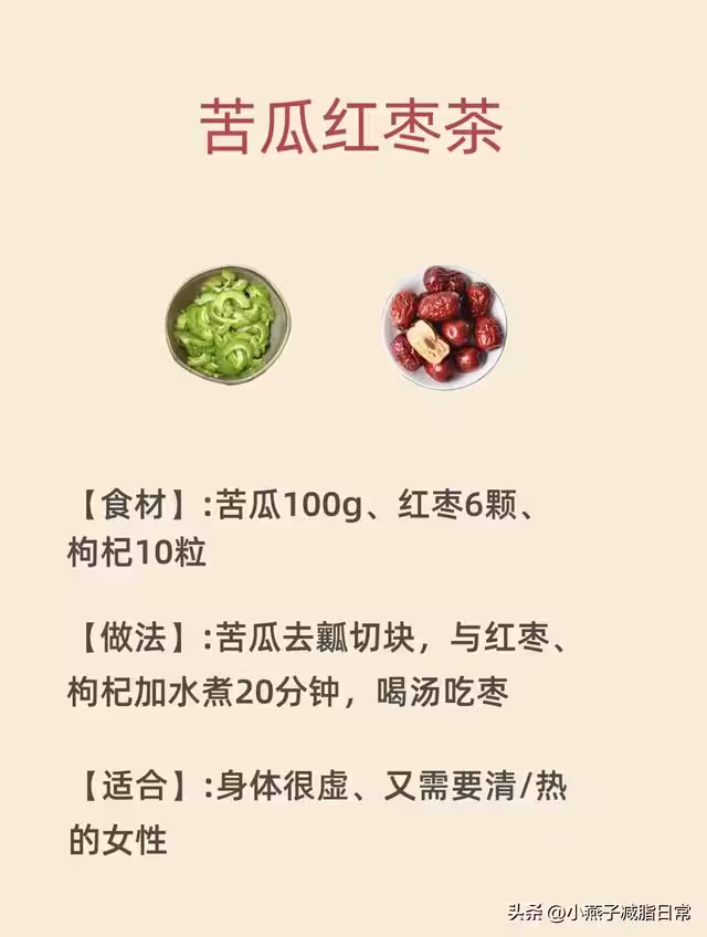 做法:苦瓜去瓤切塊,和紅棗、枸杞加水煮20分鐘,喝湯吃棗!
