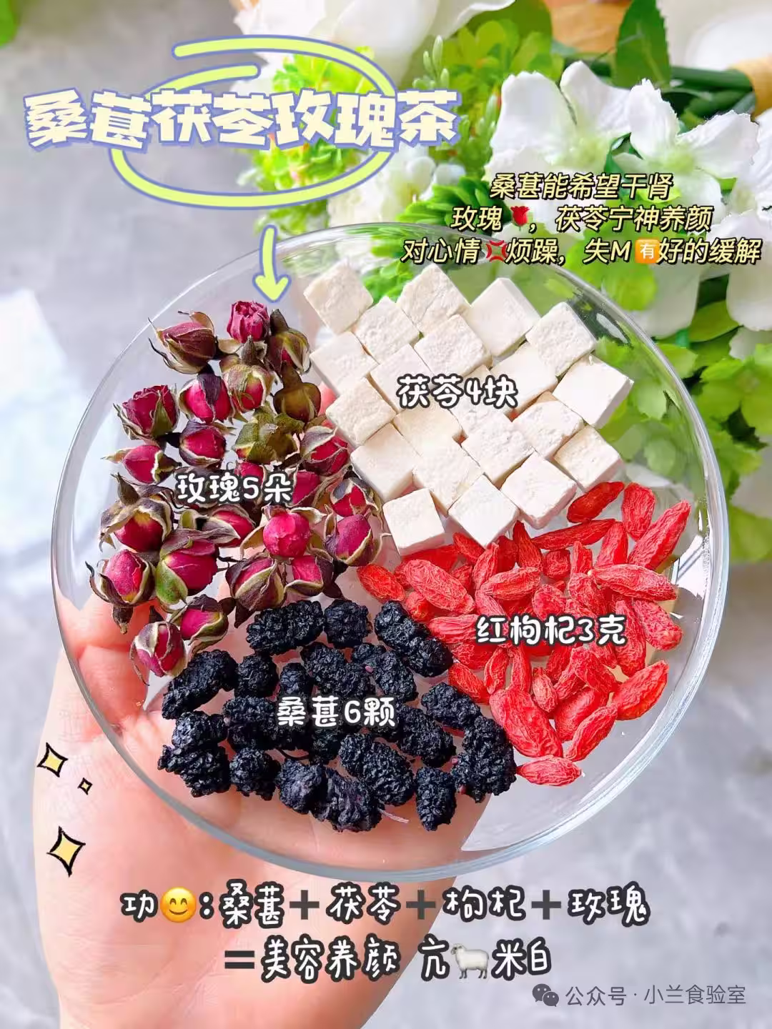 - 美容養顏、美白、寧神養顏。桑葚益腎,玫瑰和茯苓緩解煩躁,對失眠有良好效果。