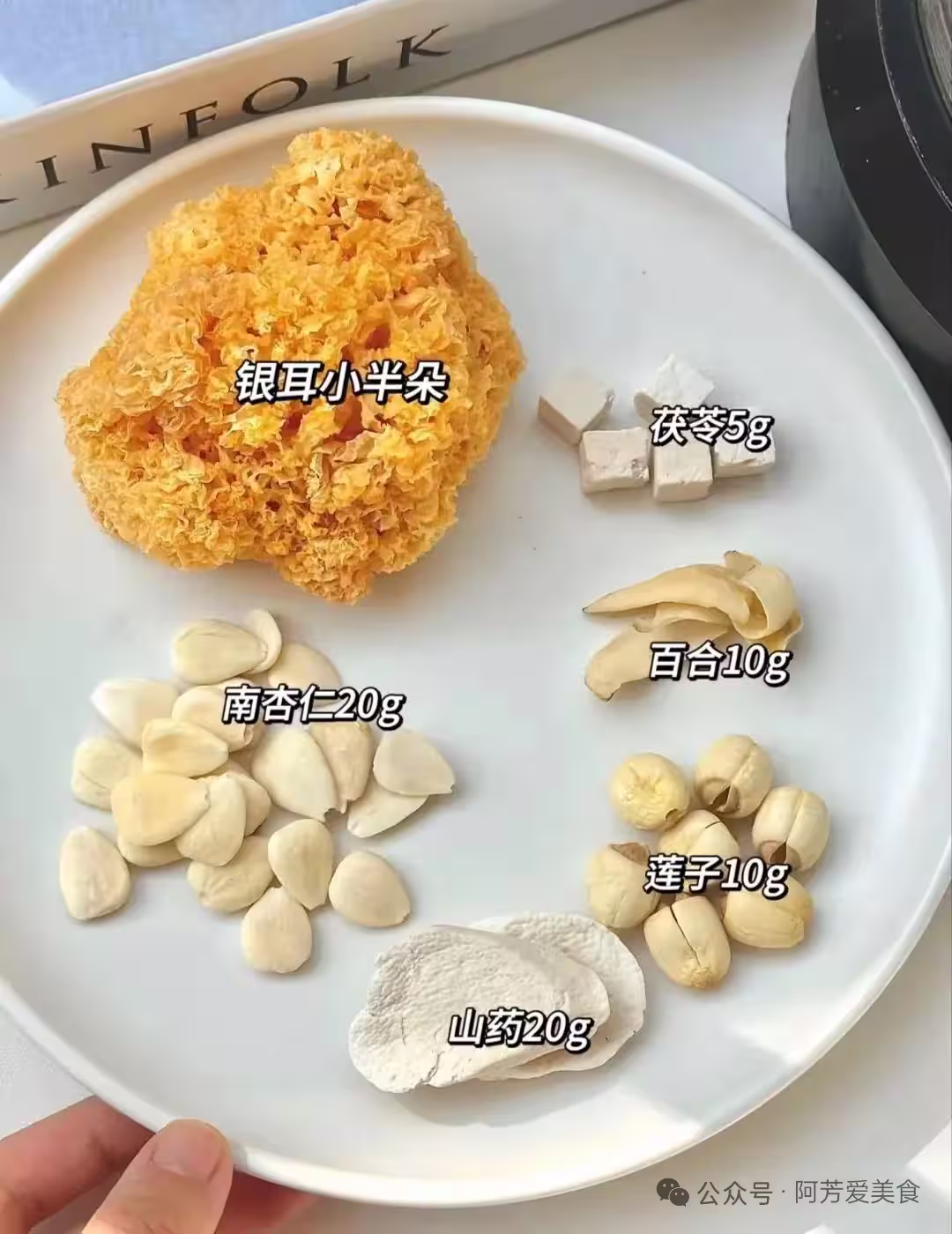 食材:干百合10克、干蓮子10克、南杏仁20克、清水600ml(可選加少許冰糖調味)。