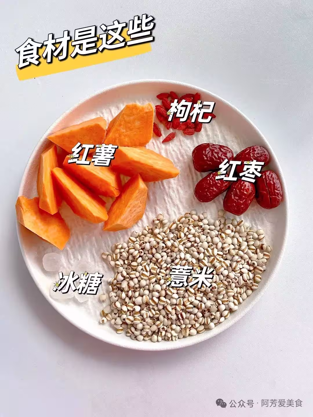 食材:紅薯1個(中等大小),薏米一小把,紅棗幾顆,枸杞一小撮,冰糖適量。