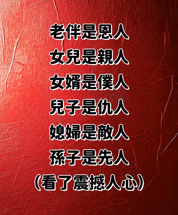 老伴是恩人,女兒是親人,女婿是僕人,兒子是仇人,媳婦是敵人,孫子是先人(看了震撼人心)!