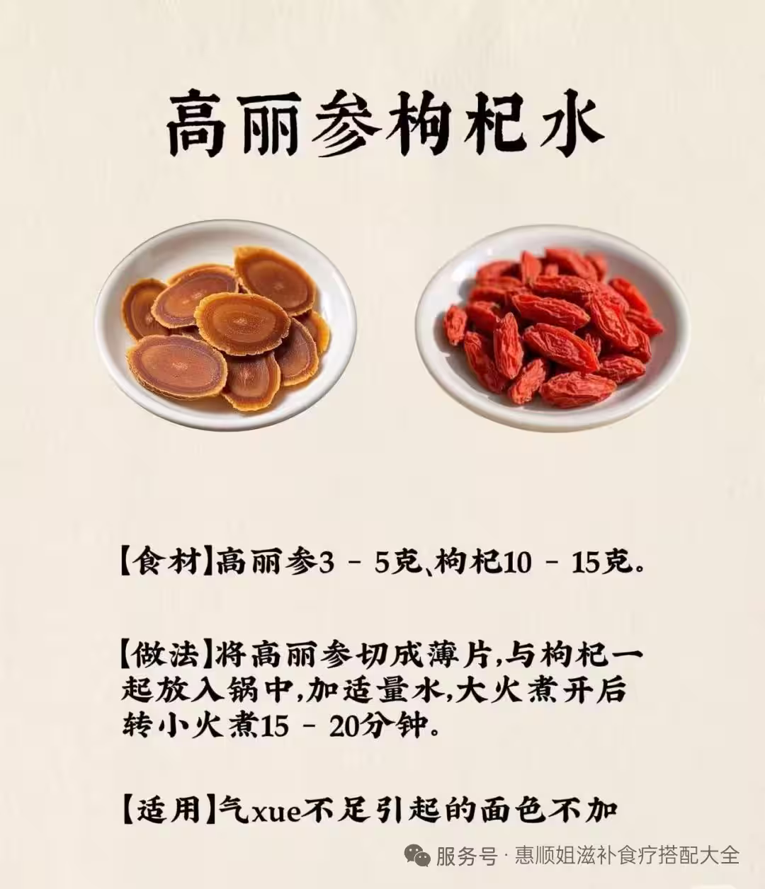 做法 :將高麗參切成薄片,與枸杞一起放入鍋中,加適量水,大火煮開後轉小火煮15—20分鐘。