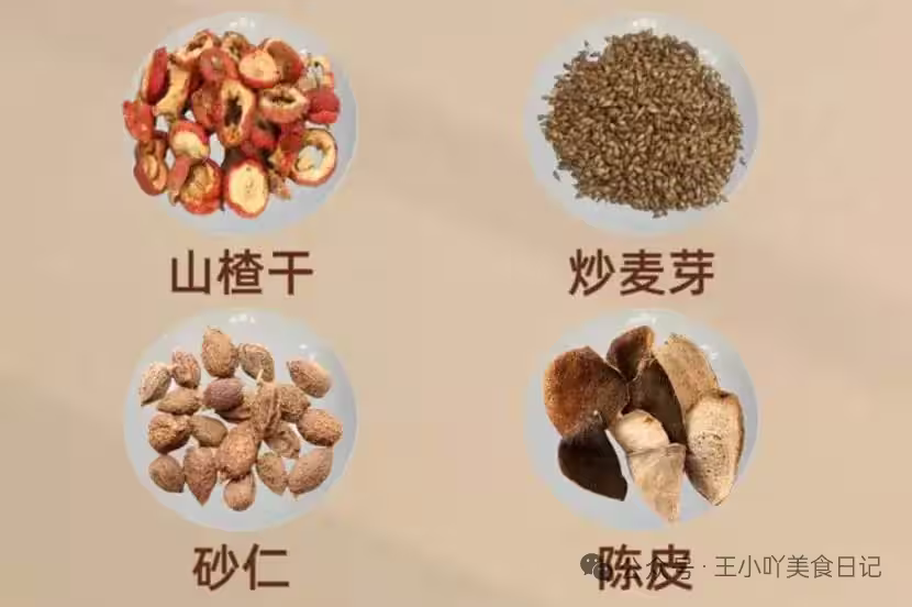 材料:山楂15克、炒麥芽10克、砂仁10克、陳皮5克