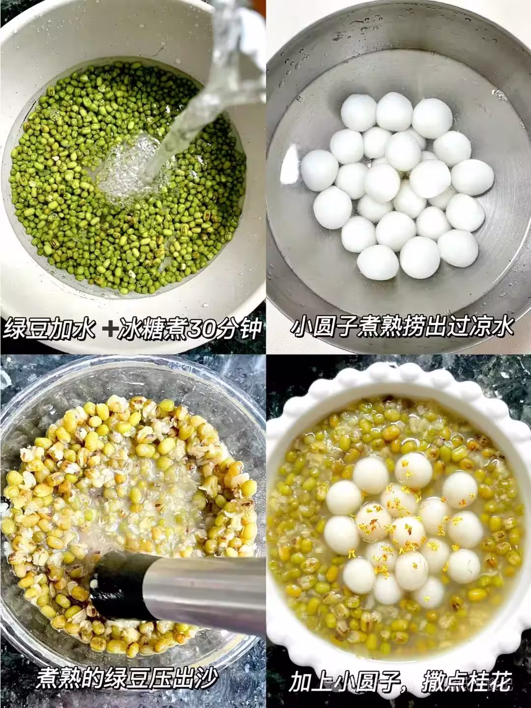綠豆加水和冰糖,煮大約30分鐘,煮到豆子開花。另起一鍋水把小圓子煮熟,撈出來用涼開水沖一下,這樣口感更Q彈。