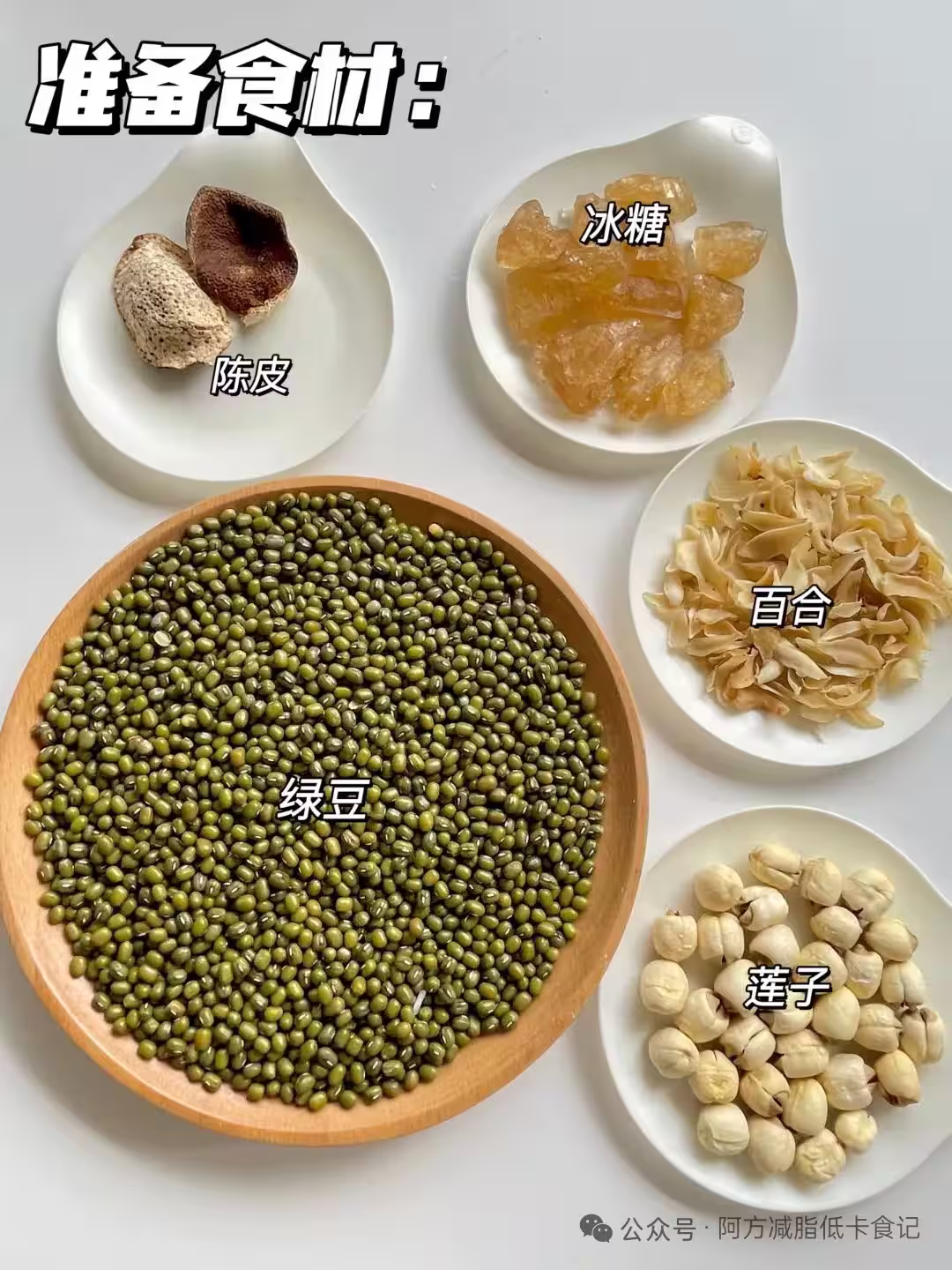 蓮子、干百合提前用溫水泡軟(至少半小時)。綠豆、泡好的蓮子、百合、陳皮片一起放入鍋中,加入足量清水。