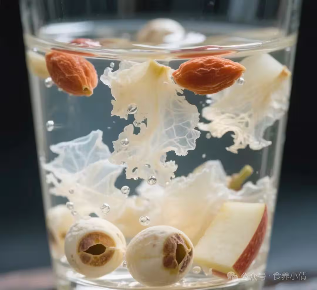食材:蘋果1個(去核切塊)、干銀耳1小朵(提前泡發撕小朵)、干蓮子15克(提前浸泡1小時)、清水1000毫升。