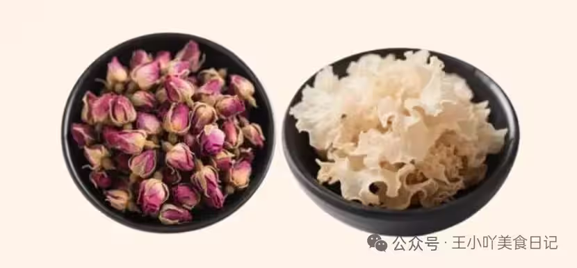 皮膚比較乾燥、想滋潤一下的姐妹,這杯茶能讓你肌膚水潤。先把泡發的銀耳煮10分鐘,再加入玫瑰花和百合燜5分鐘。喝起來口感豐富,既有銀耳的軟糯,又有玫瑰的芬芳,滋潤又美味。