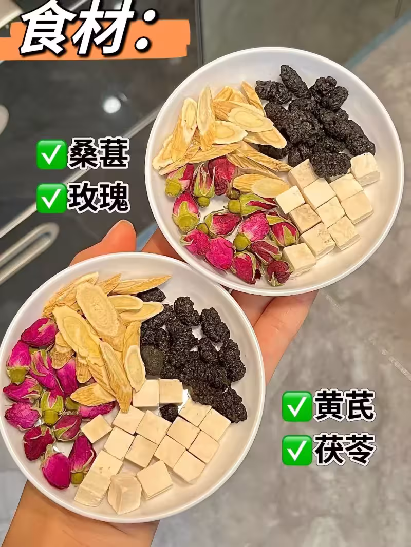 將茯苓和黃芪稍微用水沖一下,放進小鍋里,加兩碗清水。然後大火燒開後轉小火,煮大約十五分鐘。在關火前五分鐘,把桑葚和玫瑰花放進去,蓋上蓋子燜一會兒就好。晾到溫熱時倒進杯子。