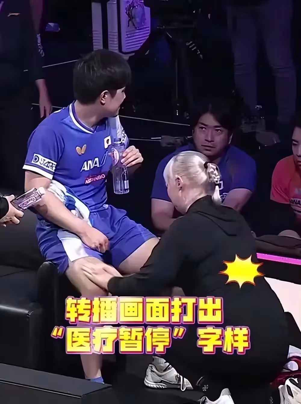 當王楚欽憑藉頑強的韌性追回兩局,將總比分追至2比3,比賽氣氛再次升溫時,意外的轉折發生了。張本智和向裁判示意自己左膝受傷,並請求醫療暫停。