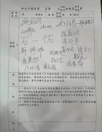 說明寫到,第一,新北市113年扣除負債後整體凈資產增加1724億元,另有稅收超收62億元及歲出未執行預算94億元,合計財政盈餘達1880億元。第二,依此財源推估,新北市404萬人,每位市民可普發現金4.6萬元,具可行性且財力充足。第三,建請市府儘速規劃普發現金方案,落實還稅於民,並以實質回饋紓解市民生活壓力。