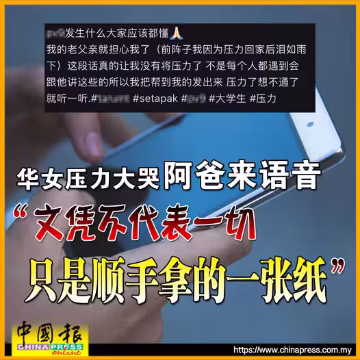 華女壓力大哭 阿爸來語音 「文憑不代表一切 只是順手拿的一張紙」