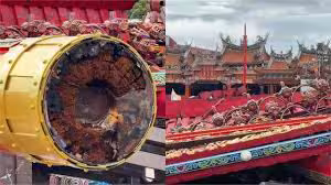 丹娜絲颱風吹垮台南南鯤鯓代天府前別具歷史意義的牌樓,廟方上網po文希望各界善款能夠協助重建,台北宮廟捐款1050萬元,還特別搬現金到神明供桌前,堆成鈔票山,希望向神明信眾展現誠意,也拋磚引玉鼓勵更多捐款。