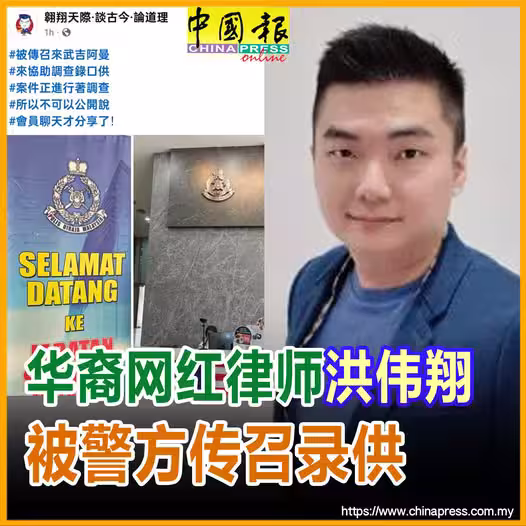 (吉隆坡25日訊/20:00更新)著名華裔網紅律師洪偉翔今午被傳召到武吉阿曼警察總部,錄口供約兩小時半,協助警方調查一宗「超級大案」!
