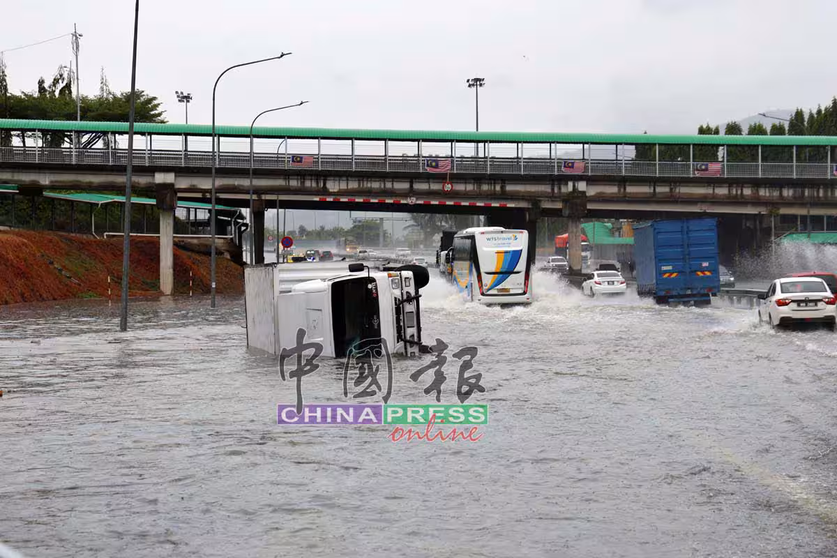 據《中國報》記者在現場了解,該路段積水深度一度超過一尺,大道旁溝渠的水因連綿大雨迅速淹上車道,導致北上方向左側與中間車道被迫關閉,南下方向右側車道同樣因淹水封鎖。