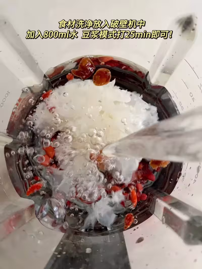 將所有處理好的銀耳、花生、紅豆、桂圓肉和枸杞一起放入破壁機中,再加入800毫升的清水,選擇豆漿模式。喜歡甜一點的可在這時加少許紅糖,也可以打好後再按個人口味調整。