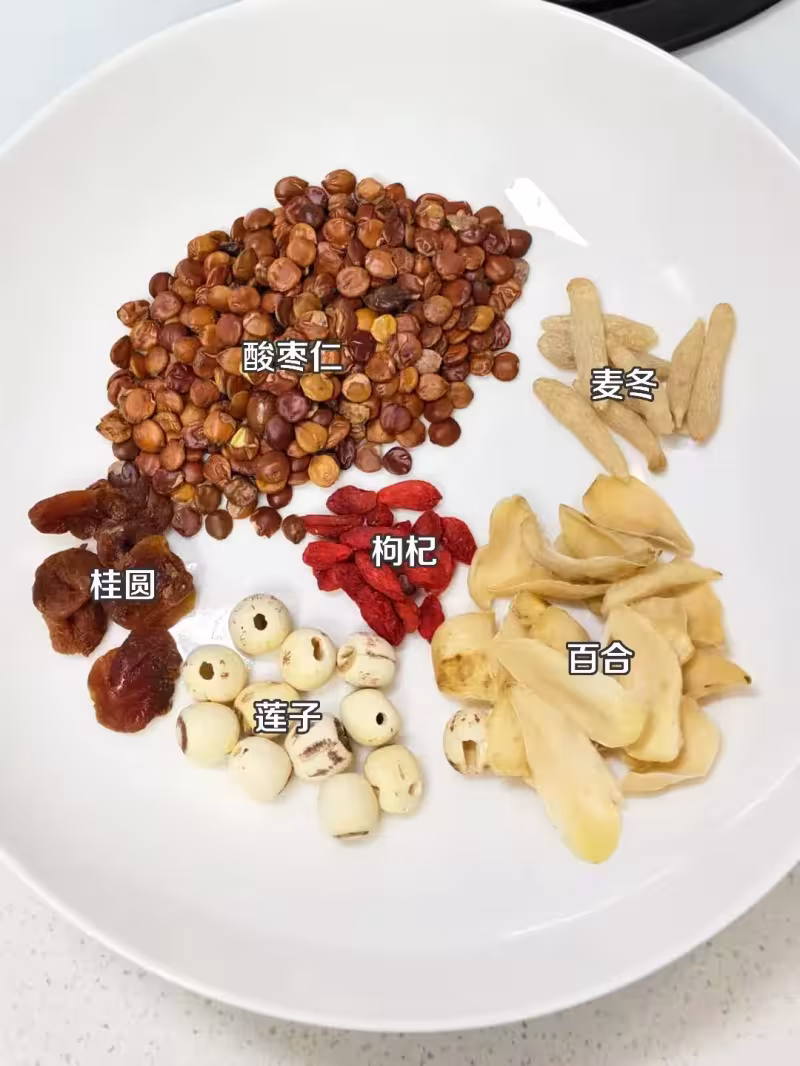 我準備的食材有酸棗仁、麥冬、枸杞、桂圓、百合和蓮子。這些都是平時容易買到的,也不貴,煮一鍋可以喝兩三天。