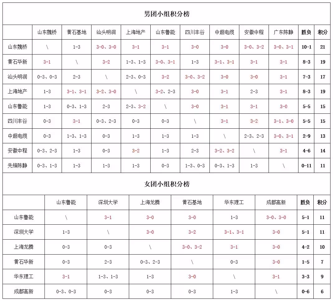 19:00,山東魏橋·向尚運動男團VS中超電纜·福建安井男團、黃石華新男團VS四川豐谷男團、山東魯能男團VS先鋒乒羽陳靜男團,深圳大學女團VS成都高新若水居女團、上海龍騰女團VS華東理工大學女團。