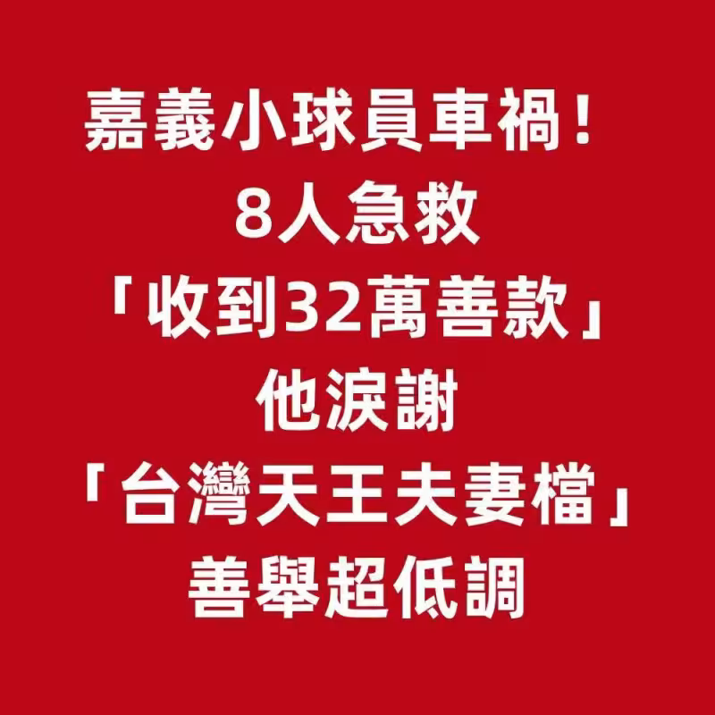 嘉義小球員車禍!8人急救「收到32萬善款」...他淚謝「台灣天王夫妻檔」善舉超低調。